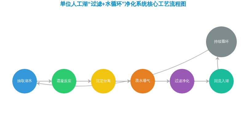 更重要的是,通过系统的循环净化处理,人工湖的水质各项指标将逐步达到或接近国家标准,实现水质达标。下图展示了净化系统的核心工艺及其在各环节的作用。
